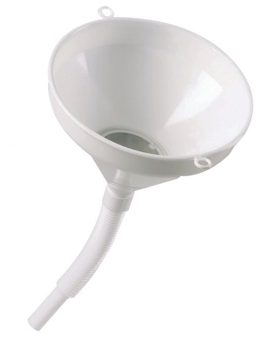 Entonnoir plastique à bec flexible avec filtre coloris blanc.